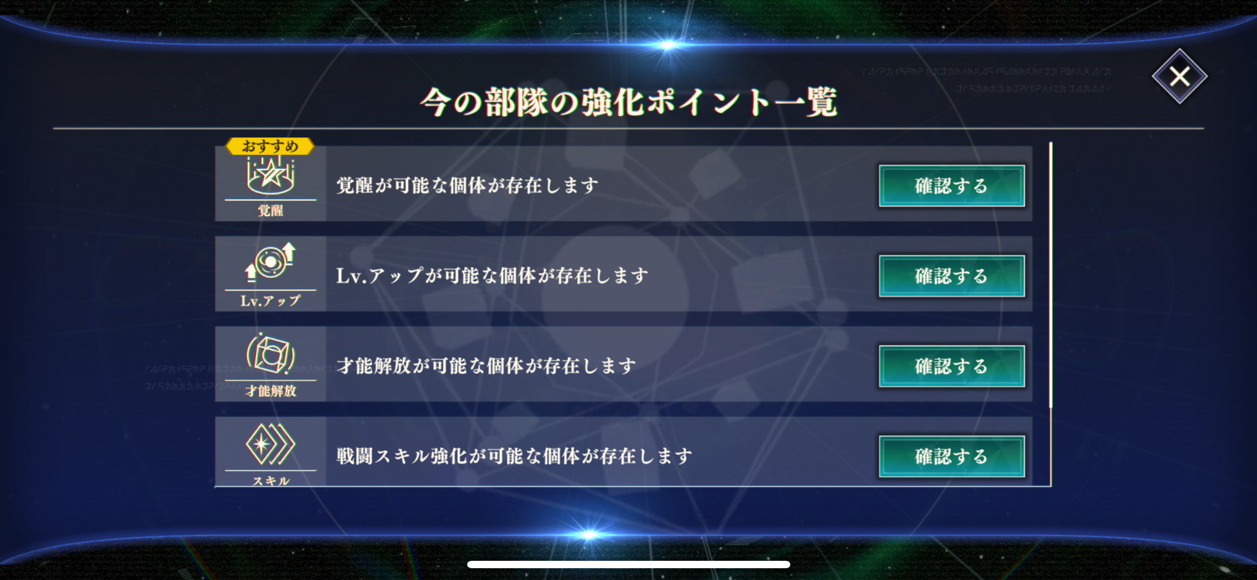 「今、何をしたらいいかわからない……」「今の部隊を強化するには?」など、困った際はホーム画面左上からいつでも大賢者に相談ができます。