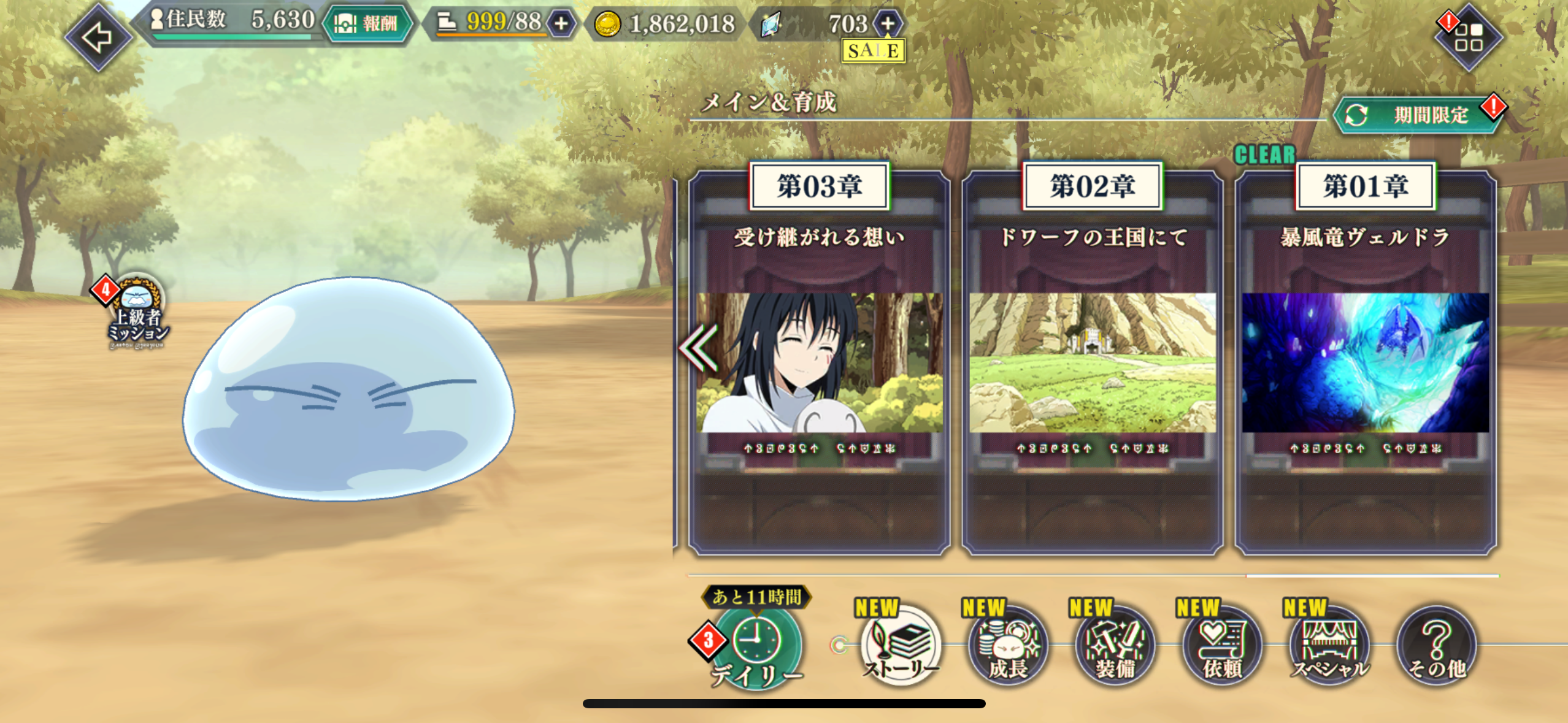 「まおりゅう」では、メインストーリーを進めることで「転生したらスライムだった件」本編のストーリーを体験できます。
