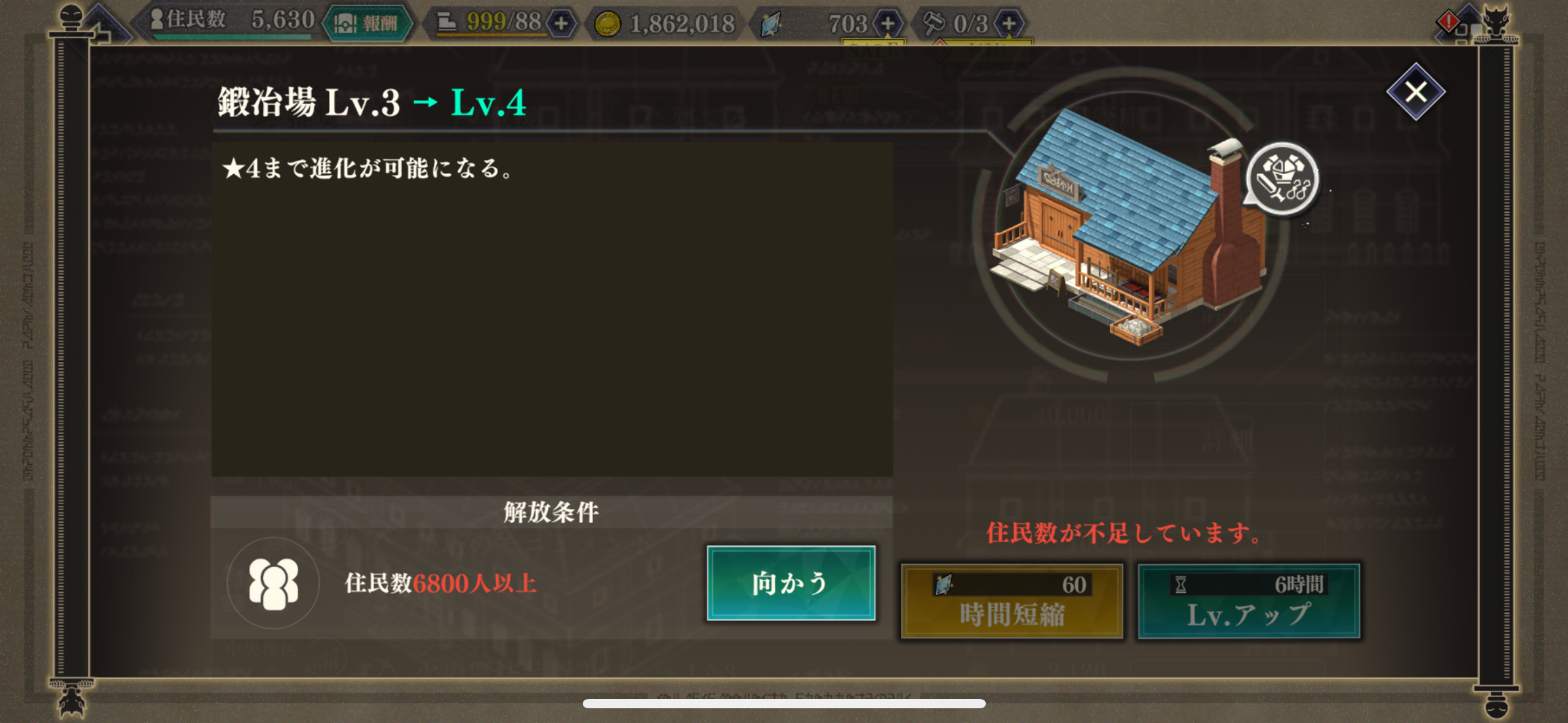 住民数6万人までの盟主さまを対象に、施設の建築時間と必要金貨数が半減するキャンペーンを実施中!
