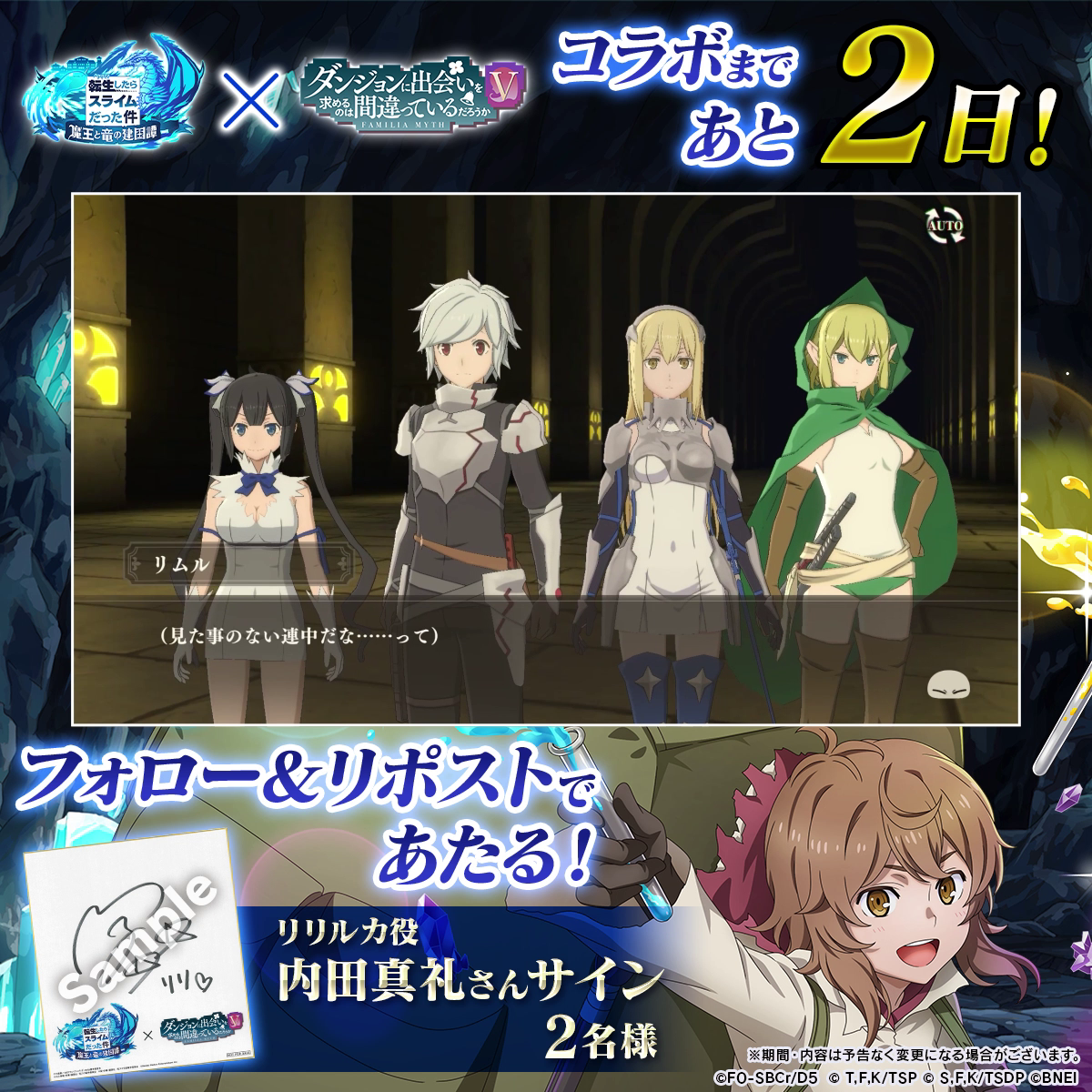 ・株式会社バンダイナムコエンターテインメント(以下、当社といいます)は、【転生したらスライムだった件 魔王と竜の建国譚】(以下、本サービスといいます)に関連して「まおりゅうダンまちコラボ開始カウントダウンキャンペーン【2日前】」(以下、本キャンペーンといいます)を実施いたします。