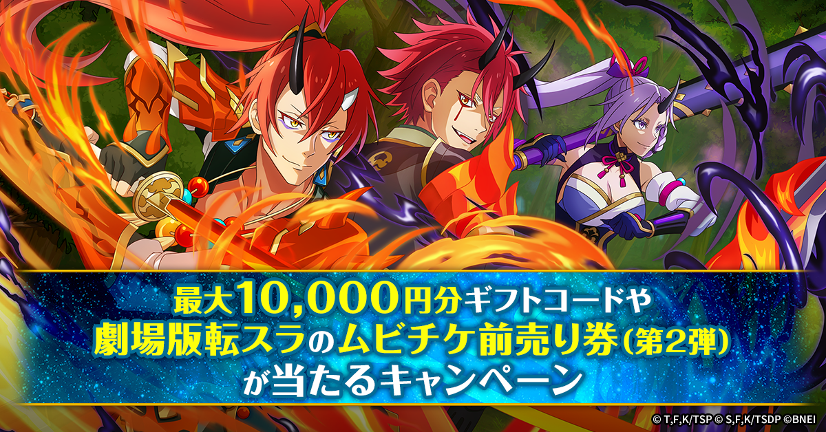 ・株式会社バンダイナムコエンターテインメント(以下、当社といいます)は、「転生したらスライムだった件 魔王と竜の建国譚」(以下、本サービスといいます)に関連して「最大10,000円分ギフトコードや劇場版転スラのムビチケ前売り券(第2弾)が当たるキャンペーン」(以下、本キャンペーンといいます)を実施いたします。